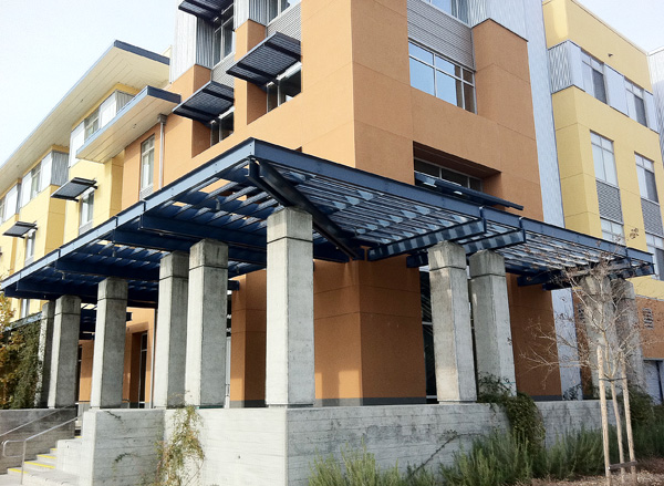 Student housing project included exterior railings, metal structures, and aluminum trellises.